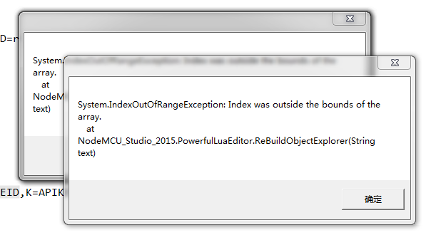 按http://www.placeboworld.cn/help/20.html例程用NodeMCU Studio 2015打開kaiguan.lua文件時彈窗:System Index Out Of Range Excption:Index was outside the bounds of the array at NodeMCU_Studio Powerful LuaEditor Re Build Object Exploer (String text)是什么情況?該怎么解決?謝謝!